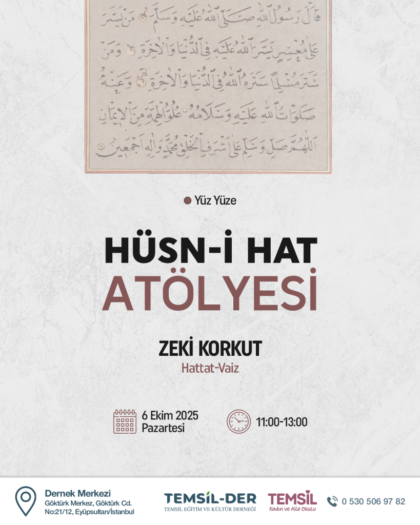 Temsil Kadın ve Aile Okulu projemiz kapsamında gerçekleştireceğimiz “Hüsn-i Hat Atölyesi”ne davetlisiniz. Hattat-vaiz Zeki Korkut’un yürütücülüğünde gerçekleşecek atölyemizde hat sanatının tarihini, yazı çeşitleri incelenecek ve yazı meşkleri icra edilecektir.